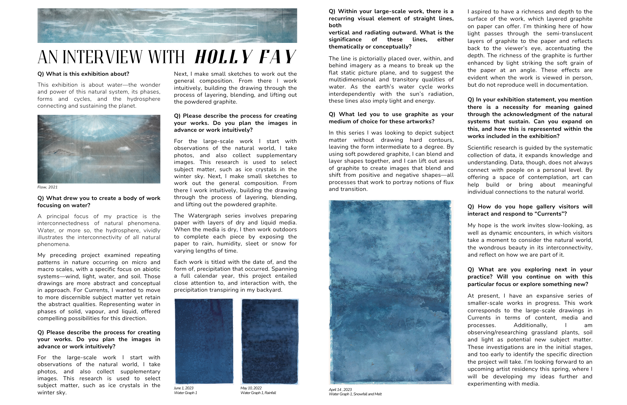 In the large-scale works included in Currents, subtle layers of graphite (a form of carbon—the other element on which all life is based) were applied to the surface of the paper in a succession of building up, lifting, and reapplying. Created through additive and subtractive manipulations of layered graphite, forms are void of defined boundaries or contours, evoking fluidity and continual flux. Linear marks in the picture plane propose the multidimensional aspects of physical space and the transitory qualities of water, energy, and movement. The drawing process is a means to visually conceptualize the wonder present throughout this underpinning of the natural world.