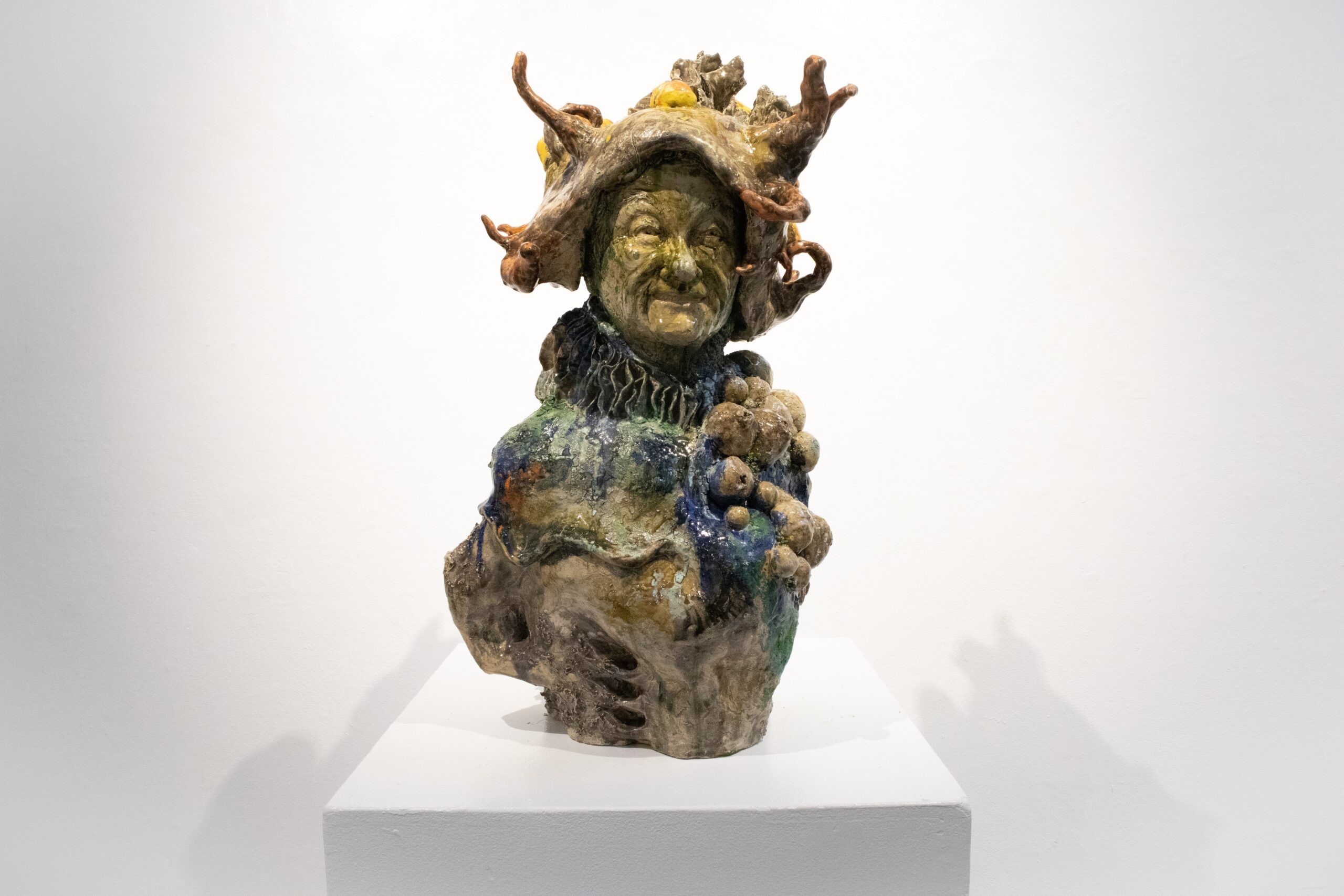 This body of figurative ceramic sculptures tells the story of the Wearers, a fictional community who, following an ecological catastrophe of near-mythological origins, survived their new treacherous landscape through two pivotal adaptations. Through the consumption of plentiful terrestrial macro algae they developed the ability to photosynthesize, an ability that has given them bright green complexions. The second adaptation is the creation of the BioSuits: living protective garments made of a symbiosis of fungi, moss, lichen, and algae. The BioSuits act as mycoremediating partners cleansing the environment around the Wearer to ensure their safety. In return for this gift the Wearers offer the BioSuits a stronger chance at reproduction. The Wearers are forever displaced, bound to walking generational migrations to avoid cyclical environmental hazards that wrack the earth’s surface. As they walk, the BioSuits accompany them, dispersing their spores over great distances. Over time, over generations of these cycles, the descendants of the BioSuits will eventually mycoremediate the entire planet.