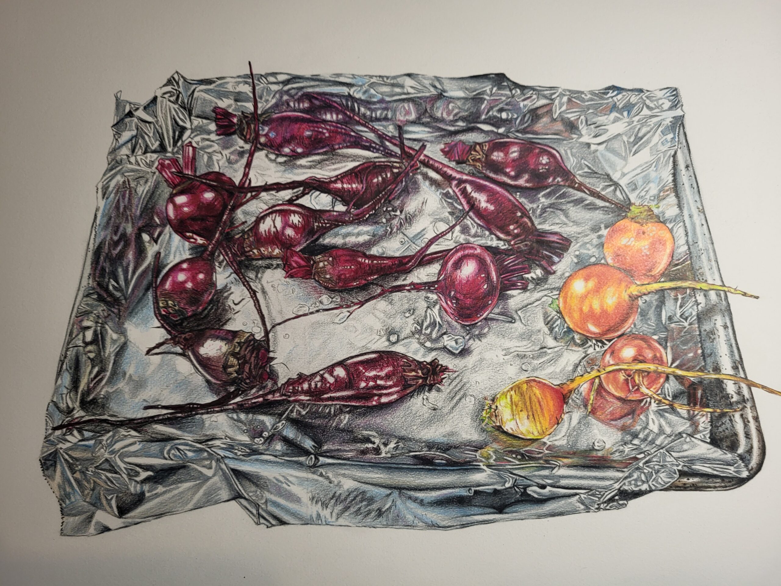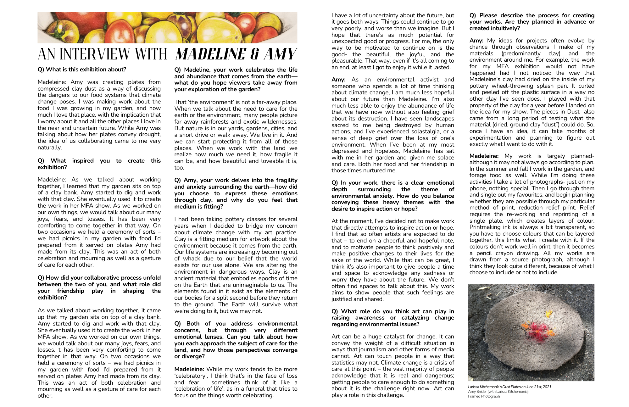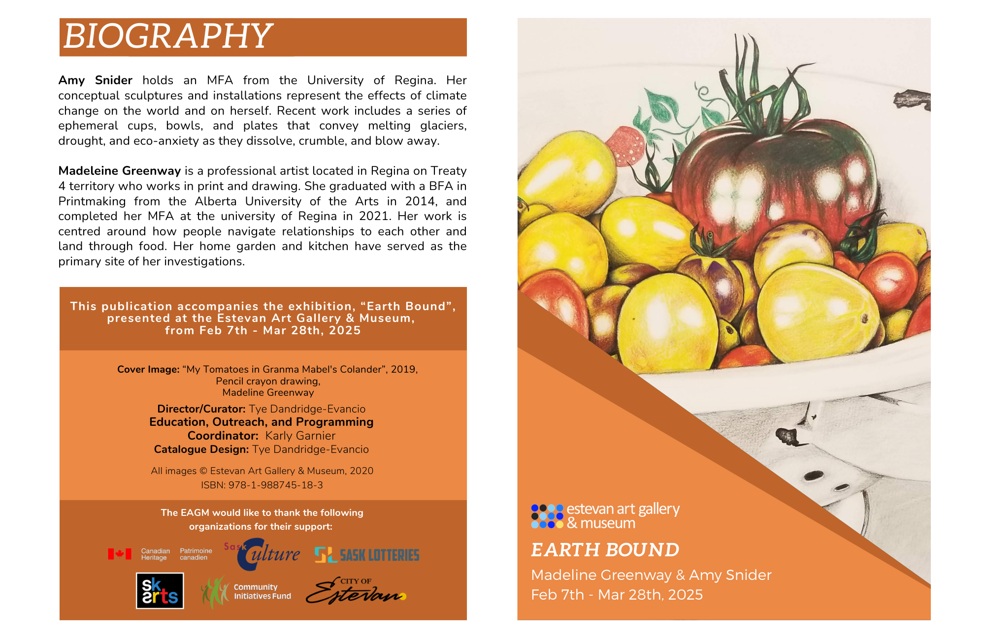 In Earthbound, Madeleine Greenway and Amy Snider show very different works produced from the same piece of earth. Greenway’s garden in North Central Regina is the origin of this earth. The two engage with this site to convey a shared concern for the state of the environment through their differing vantage-points. Whereas Greenway’s drawings and prints celebrate the bounty of life that grows from her garden’s soil, Snider’s pieces engage the clay beneath it to convey the grief and anxiety that come with an understanding of the precarity of our survival on this planet.