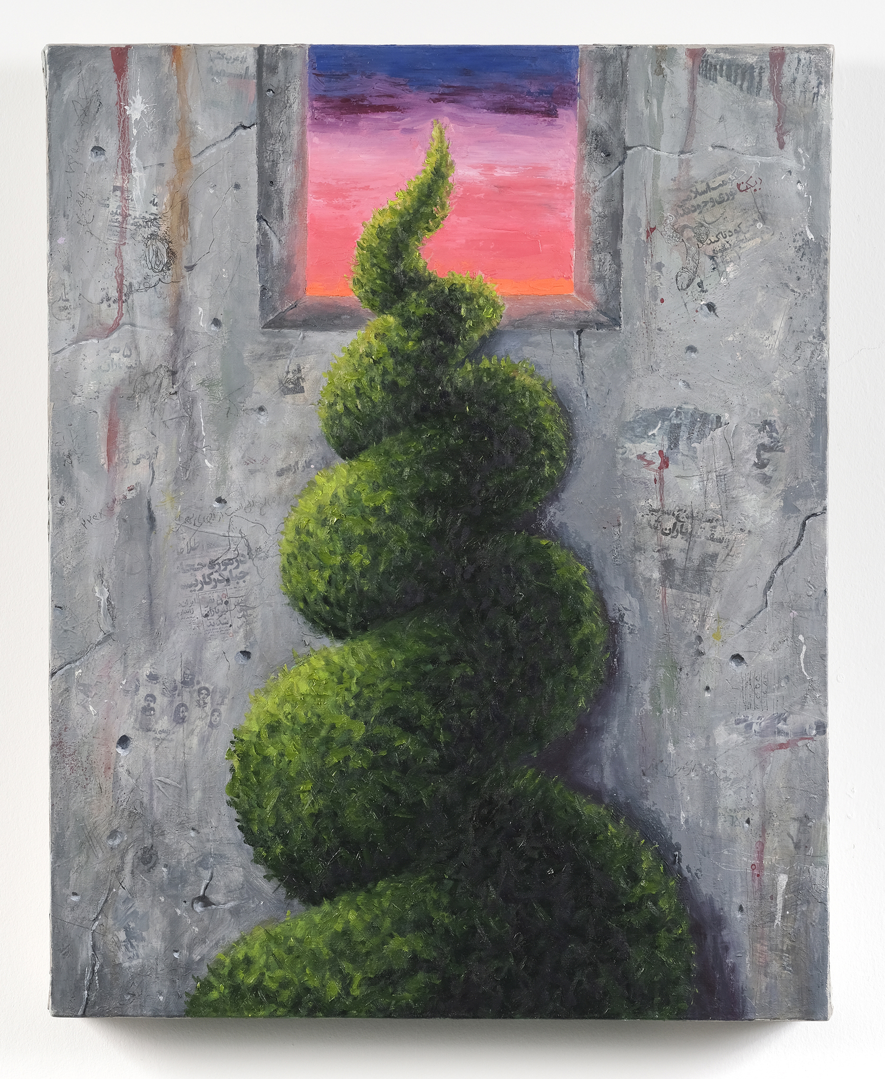 The Burden of Street brings together paintings that depict contradictory compositions to provide distinct visual experiences exploring the complexities of our surrounding built environment. The element of the wall plays a significant role in this body of work as public sites for dwellers to engage with the political and social fabric of society. These paintings aim to explore the dichotomy of walls as both tools of control and platforms for resistance. They delve into how authorities use these walls to impose their ideologies and values upon the people, while also emphasizing the agency of dissidents who transform these spaces into channels of protest and expression. A diverse range of artistic techniques and mediums, including collage, painting, drawing, and graffiti, are used to create satirical and ironic situations that reference the deep dualities, disparities, and hypocrisies inherent in ruling systems.