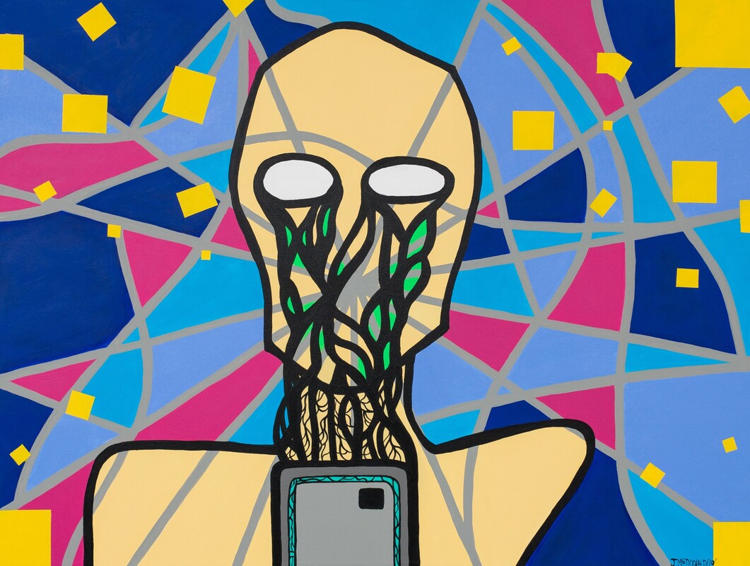 His exhibition, “Omentum” is a series of 10 paintings which touch on several of the major experiences faced by Indigenous people in this country within recent memory. These paintings, influenced by both the works of Norval Morrisseau and also Pablo Picasso, speak of some of the major struggles and triumphs that are part of our everyday life as Indigenous people, such as the Missing and Murdered Indigenous Women, Cultural Appropriation, the legacy of Residential Schools, the Rise and Honour of the Two-Spirited in the LGBTQ, the Return of Traditional Indigenous Tattooing, the Rise in Systemic Racism Online, and, of course, the Murder of Colten Boushie.
