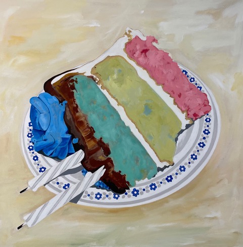 Each work of art is painted with acrylic paint, on a square framed substrate of either canvas or board, with a two-inch frame. Each dessert is meaningful. For example, Candycane Swirl Fudge is only a treat for Holiday celebrations, Marzipan Squares with their green and pink batter are my brother’s favourite, Danish Pastries dotted with jam and icing are only to be eaten Christmas morning, and a chocolate cake is always made for my son’s birthday.